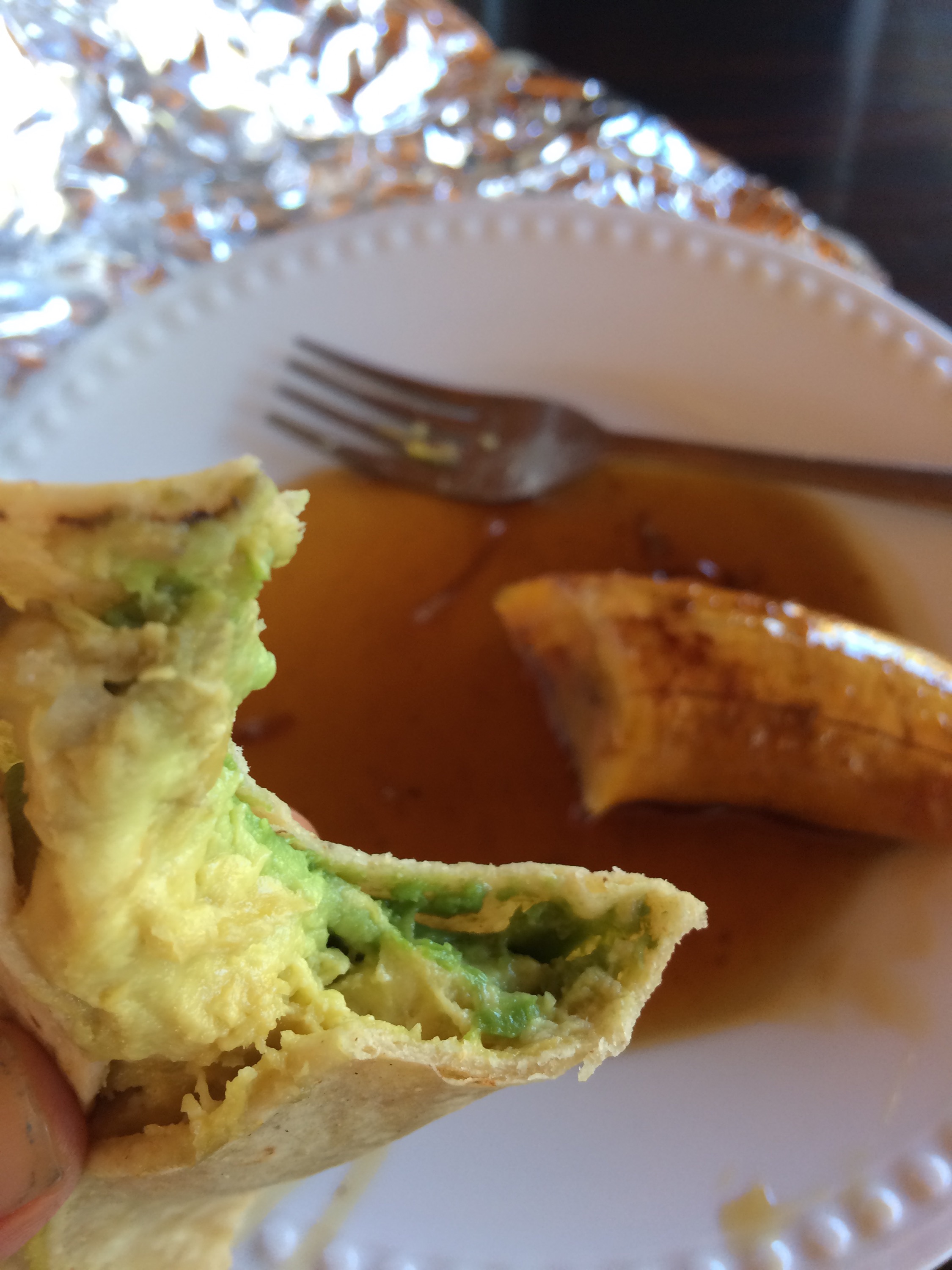 This was our snack at school. Avocado, banana in syrup and mangos
