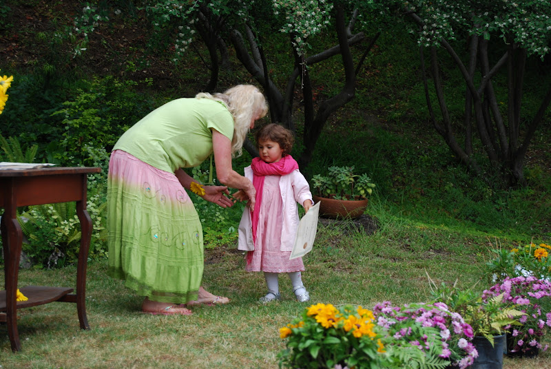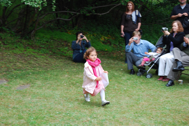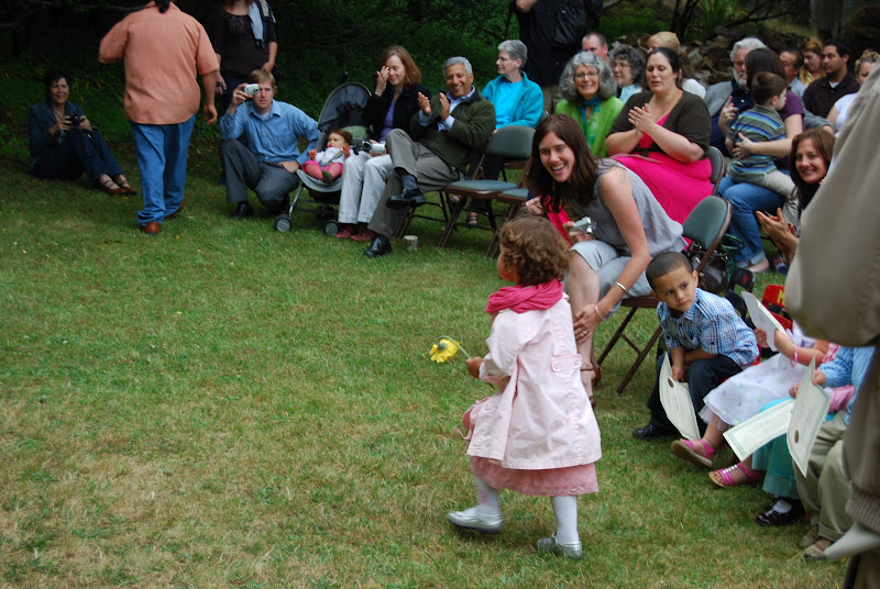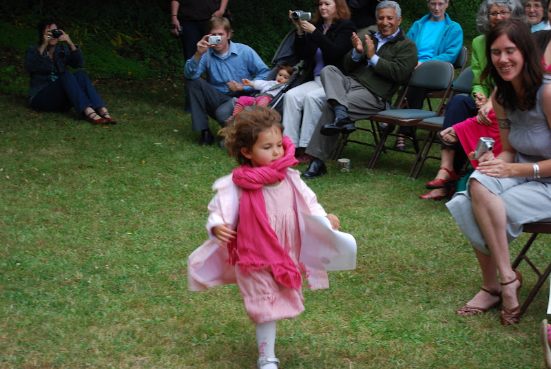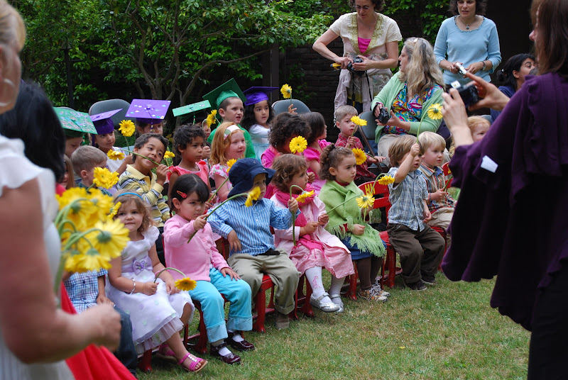 Marion’s graduated from her first year of preschool at Peter Pan on Wednesday June 9th, 2010. No longer a young child just learning the ropes in the Music Room, when she returns from break for the summer session, she will be a student in the Clay Room. As Teacher Sandy says at Peter Pan, she’s growing up. All of the students came out and were seated. In the third row the oldest kids who were moving on to Kindergarten wear their individually stylized mortarboards. The youngest kids were seated in the front row. Marion and her friend Lucy (next to her) opted to don gowns and hoods dresses and scarves.