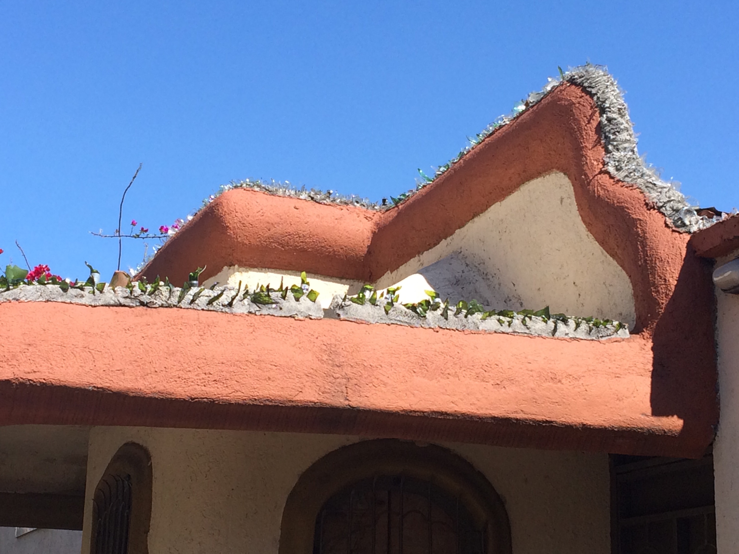 The buildings and houses in San Juaquin have lots of bars and barbed wire. This building cemented glass bottles to their roof. Way to reuse!